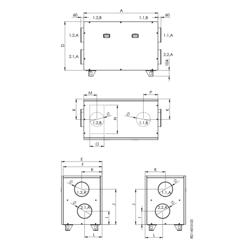 VEX1000RS fås med mulighed for afkast og/eller fraluft studs placeret i toppen af aggregatet for at give større fleksibilitet på montagestedet.