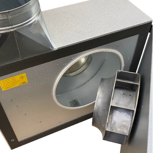 Boksventilatoren BESB250-500 er monteret med splithængsler, der sikrer, at lågen kan afmonteres ved installation og servicering selv under meget trange pladsforhold, eller ved transport på vanskelige steder.